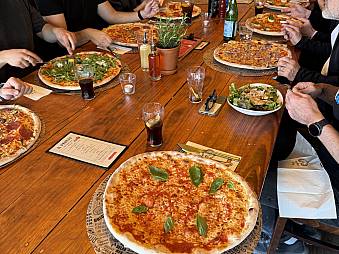 Im Anschluss verlagerte sich das Gespräch zum „Pizza-Connection“ genannten Netzwertreffen. Was zuvor auf der Baustelle begonnen hatte, wurde hier fortgesetzt: Fragen stellen, Erfahrungen teilen, Kontakte knüpfen. Netzwerken als selbstverständlicher Teil des Berufs.