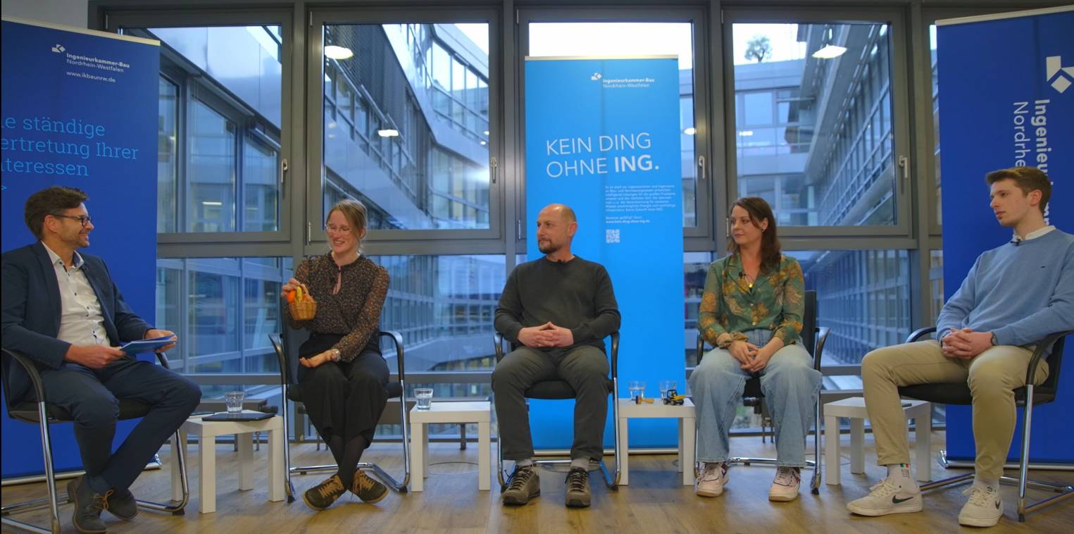 Moderiert von Ralf Erdenberger diskutierten Studierende und Berufsträger mit unterschiedlichen Perspektiven: Laura Wachter (Bauingenieurwesen, RWTH Aachen) und Ben Franke (duales Studium, TH OWL Detmold) stehen am Ende ihres Studiums bzw. sind gerade an der Schwelle zum Eintritt ins Berufsleben. Ragnhild Museiko ist seit einigen Jahren angestellte Bauingenieurin und Björn Semler ist als öffentlich bestellter Vermessungsingenieur ein etablierter Büroinhaber und Arbeitgeber.